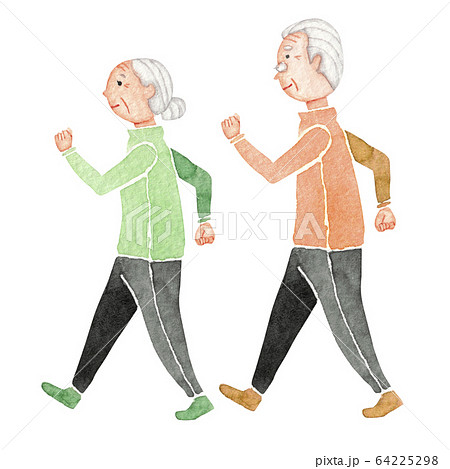 ウォーキング散歩しているシニア老夫婦 水彩 イラスト