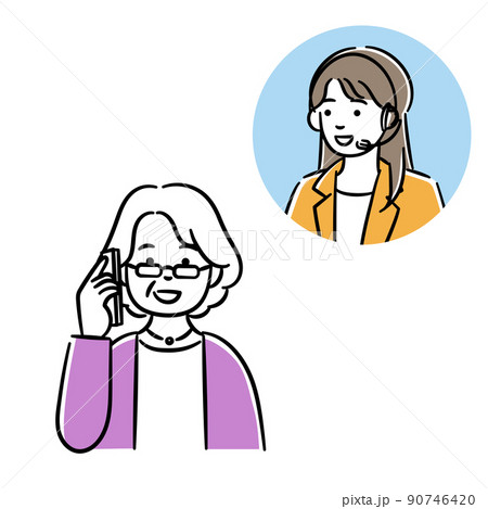 オペレーターの女性と電話で話すシニア女性のシンプルイラスト