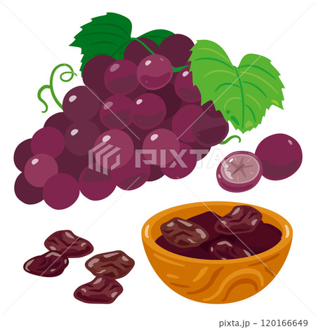 ぶどうの実と木製ボウルに入ったレーズンセット