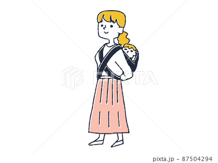 子供をおんぶ紐でおぶっている女性 コミカルな手書きの人物 ベクター、線画にシンプルな色つけ