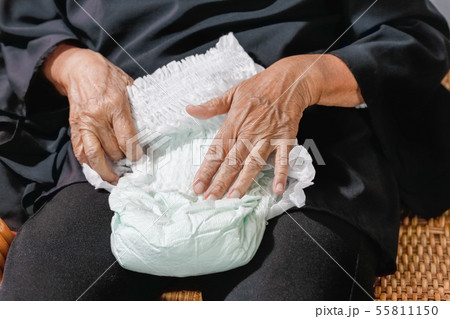 Asian elderly woman wearing diaper for loss of bladder urinary incontinence control.