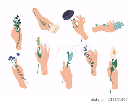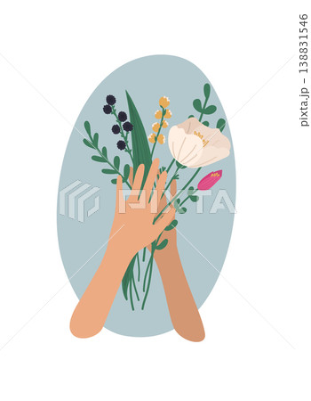 Hands holding bouquets or bunches of blooming flowers. Vector illustration.