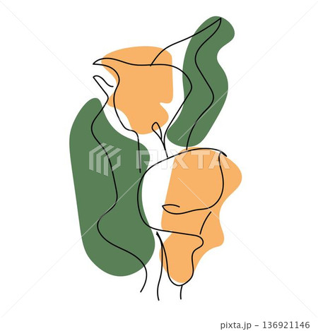 Minimalistic white calla flily lowers in a glass vase. Trendy botanical elements. Hand drawn line leaves branches and blooming.