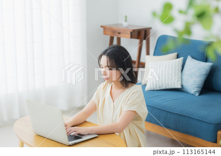 リビングでパソコンを使う若い女性