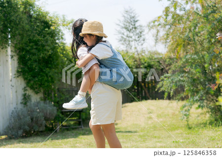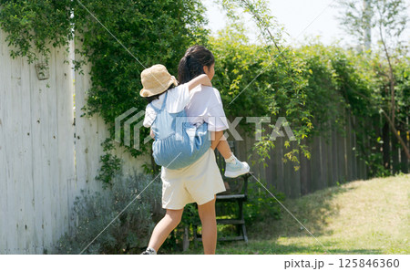 おんぶをする母と息子(親子)のイメージ