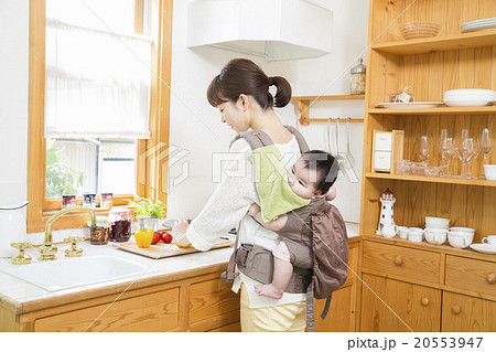 赤ちゃんをおんぶして家事をするお母さん