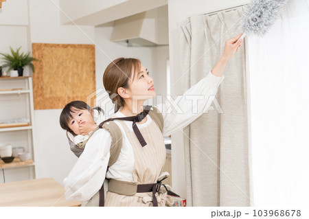 ダイニングで背負い紐で子供をおんぶしてテーブルを拭いている若い女性
