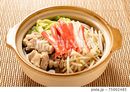 一人前サイズの小さな土鍋に入れられた、かにかまぼこと鶏肉の鍋。