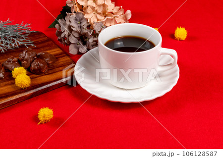 赤い絨毯に配置されたコーヒーとチョコレート、冬っぽいドライフラワーを添えて