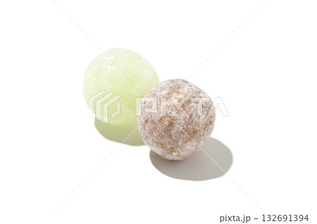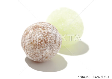コーラとメロン味の飴玉を白背景で撮影