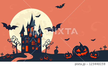 Halloween pumpkin bat with horror haunted house silhouette orange full moon dark black tree night autumn october celebration cemetery holiday, cartoon design castle evil background creepy hill grave