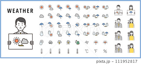編集可能な気象予報士の人物イラストと天候アイコンの素材セット