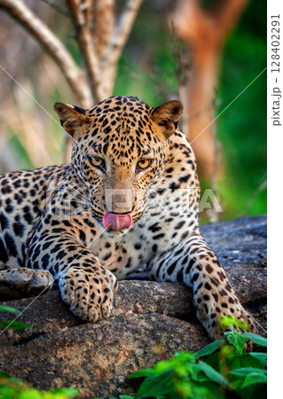 Majestic leopard lounging on a rocky surface in a lush green habitat during the golden hour