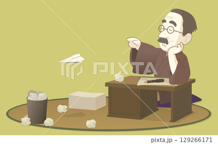 良いアイデアが出ない文豪風の小説家が原稿を紙飛行機にして遊んでいる様子を表したベクターイラスト