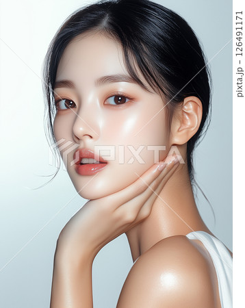 Natural beauty portrait of a Korean woman showcasing radiant skin and elegant features in a soft-toned background