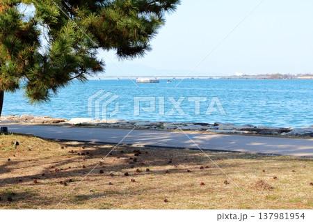 春の海津大崎、琵琶湖畔の桜並木の遊歩道