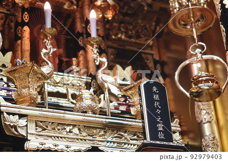 金仏壇に祀られた先祖代々の位牌と仏具2