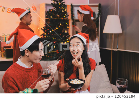 Group of young Asian man and women as friends having fun at a New Year's celebration, holding gift boxes standing by Christmas tree decoration, midnight countdown Party at home with holiday season.