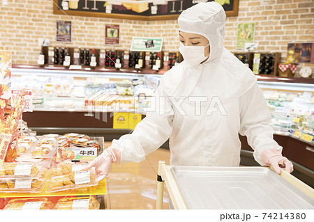 スーパーで衛生着を着てお惣菜を運ぶ女性店員