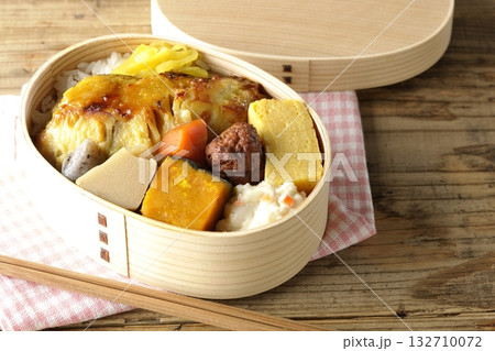 豚肉やポテサラ、玉子焼き等が曲げわっぱに入っている焼き魚弁当を白背景で撮影