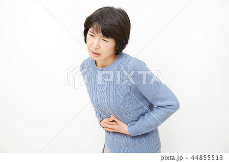 白背景で腹痛の中年女性
