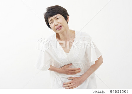 腹痛がするシニア女性 白バック