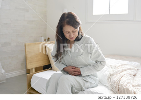 腹痛のパジャマを着た中年の女性