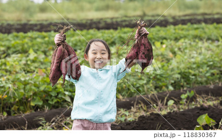 サツマイモを収穫するかわいい女の子