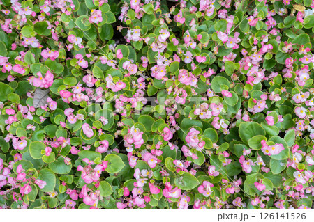 Blooming pink begonias, semperflorens begonias.
