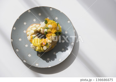 ラッピングされたお花しぼりあんこケーキ