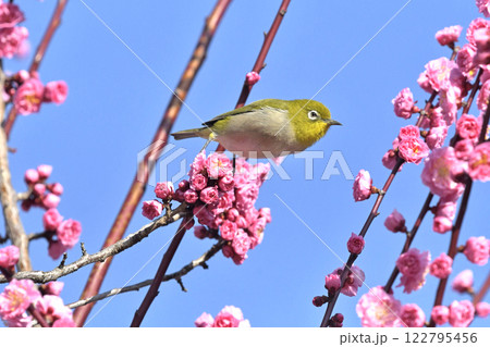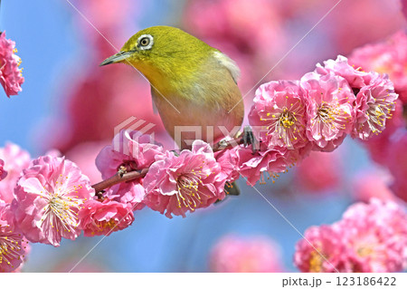 満開の紅梅にメジロさん ( 春イメージ )( 春うららかイメージ )