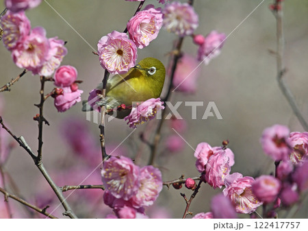 満開の紅梅にメジロさん ( 春イメージ )( ほのぼのイメージ )