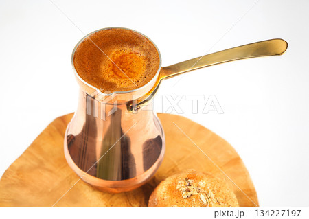 Rustic image of a clay cezve with creamy Turkish coffee on a wooden surface