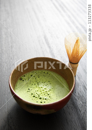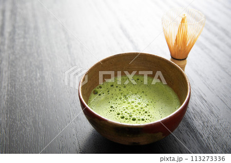茶道、抹茶、黒いテーブルに抹茶茶碗と茶筅