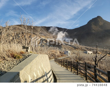 冬の大涌谷です。寒気のなか、立ち上る煙がきれいに澄んで見えます。パワースポット・観光スポットです。