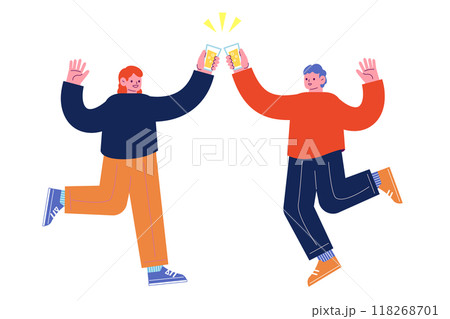飲み物を持ち乾杯をする若者たち。祝日を祝うパーティーを一緒に楽しむ陽気な友人達。漫画のキャラクターベ