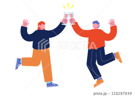 飲み物を持ち乾杯をする若者たち。クリスマスを祝うパーティーを一緒に楽しむ陽気な友人達。漫画のキャラク