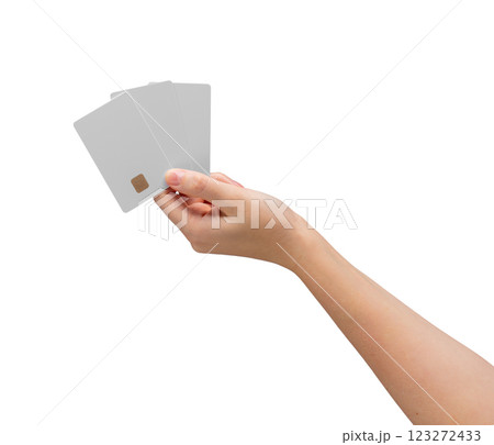 Female hand holding a blank credit card, symbolizing a financial offer, advertising, or promotional