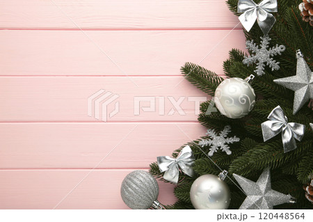 Fir-tree branches with silver christmas decorations on pink background with copy space