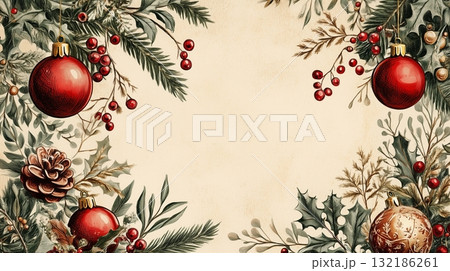 Festive Christmas backdrop with ornaments, pinecones, and copy space for holiday greetings