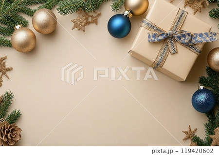 Commemorate New Year in elegance. Top view perspective of carefully wrapped giftbox, chic tree ornaments, glittery balls, seasonal adornments on beige backdrop