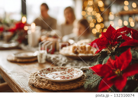 Christmas table composition. Beautiful decoration. Christmas trees, candles, stars, lights and elegant accessories. Merry Christmas and Happy Holidays, Template.