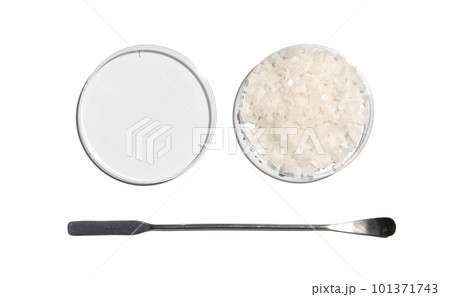 Flake salt in Petri dish with plastic lid placed next to the stainless spatula on laboratory table. Chemical ingredient for Cosmetics and Toiletries product. Top View