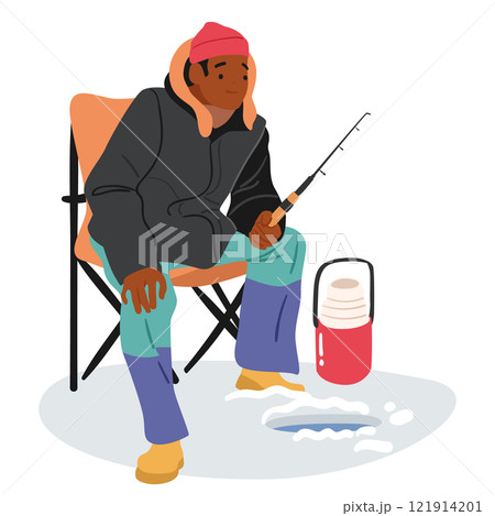 Fisherman cartoon character sitting with rod front of frozen lake hole enjoying winter fishing