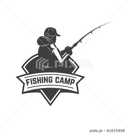 Fishing camp. Emblem template with fisherman. Design element for logo, label, sign, poster. Vector illustration