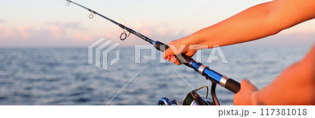 Woman sitting holding fish rod in hands