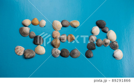 Flatlay shells forming the word sea on a blue background