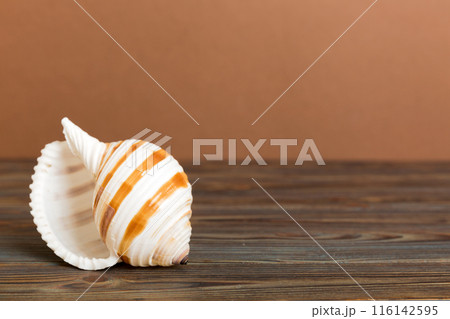Close-up of a seashell on a beige surface, natural lighting. Beach and marine concept