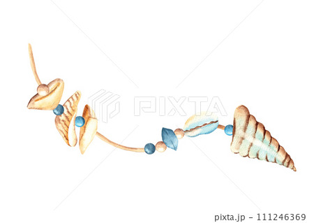 String with sea shells and stones, sea pebbles and beads. Marine design elements in pale blue yellow colors. Watercolor hand drawn illustration on white background.