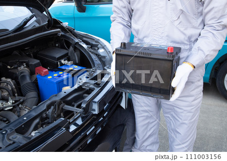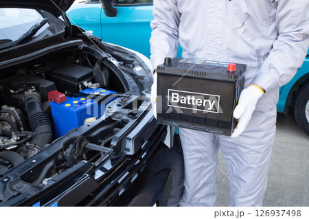 車のバッテリーを持つ整備士